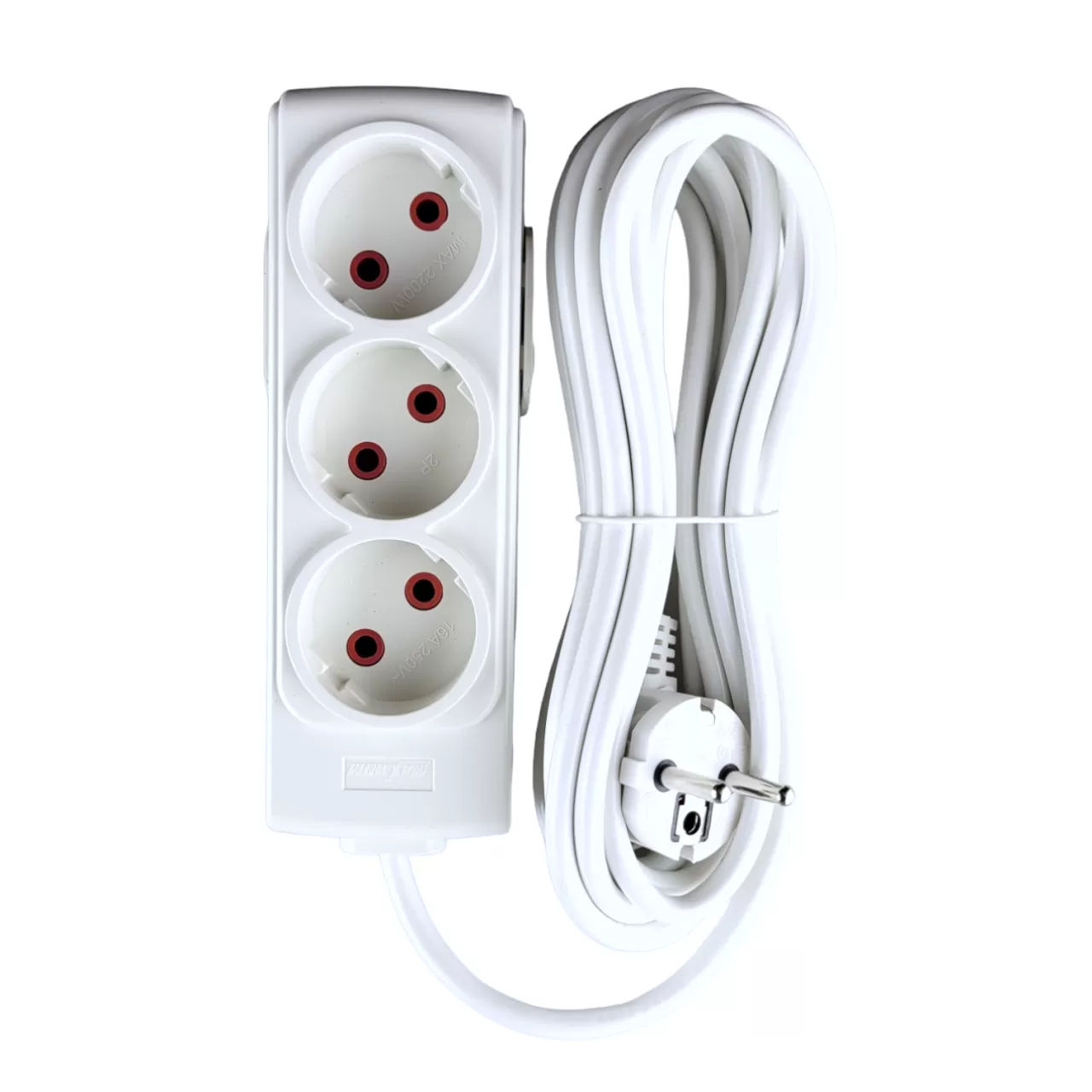 Сетевой электрический удлинитель 5 метров от "MAXIMUM QUALITY TOOLS" имеет 3 розетки на подключение к сети переменного тока. Белый корпус из негорючего АБС-пластика подходит для использования только внутри помещений.