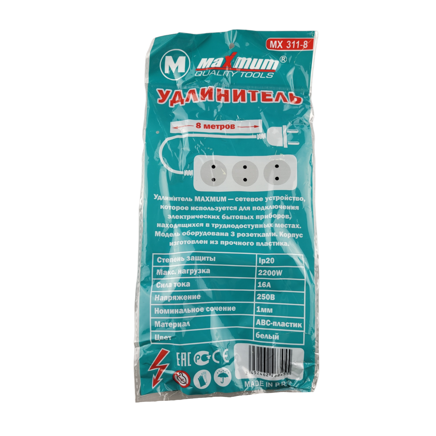 Сетевой тройник имеет номинальное напряжение 220 В, номинальное сечение 1 мм, степень защиты от пыли и воды IP 20.