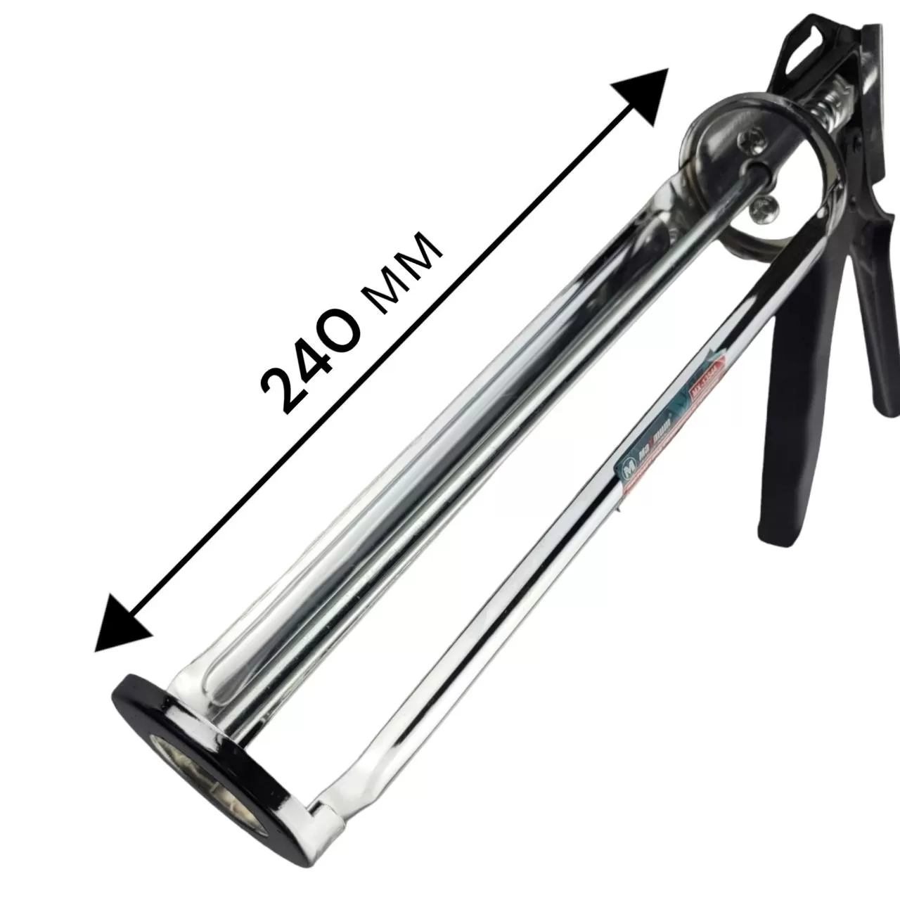 Полузакрытый пистолет для герметика до 310 мл. от «Maximum Quality Tools» создан с металлическим хромированным цилиндрическим отсеком и круглым гладким штоком, который обеспечивает точное нанесение необходимого количества смеси. Общая длина инструмента 240 мм, диаметр стального штока у основания 50 мм. Механический пистолет под герметик используется с герметиком низкой и средней вязкости. Полузакрытая конструкция позволяет работать с герметиками без упаковки.