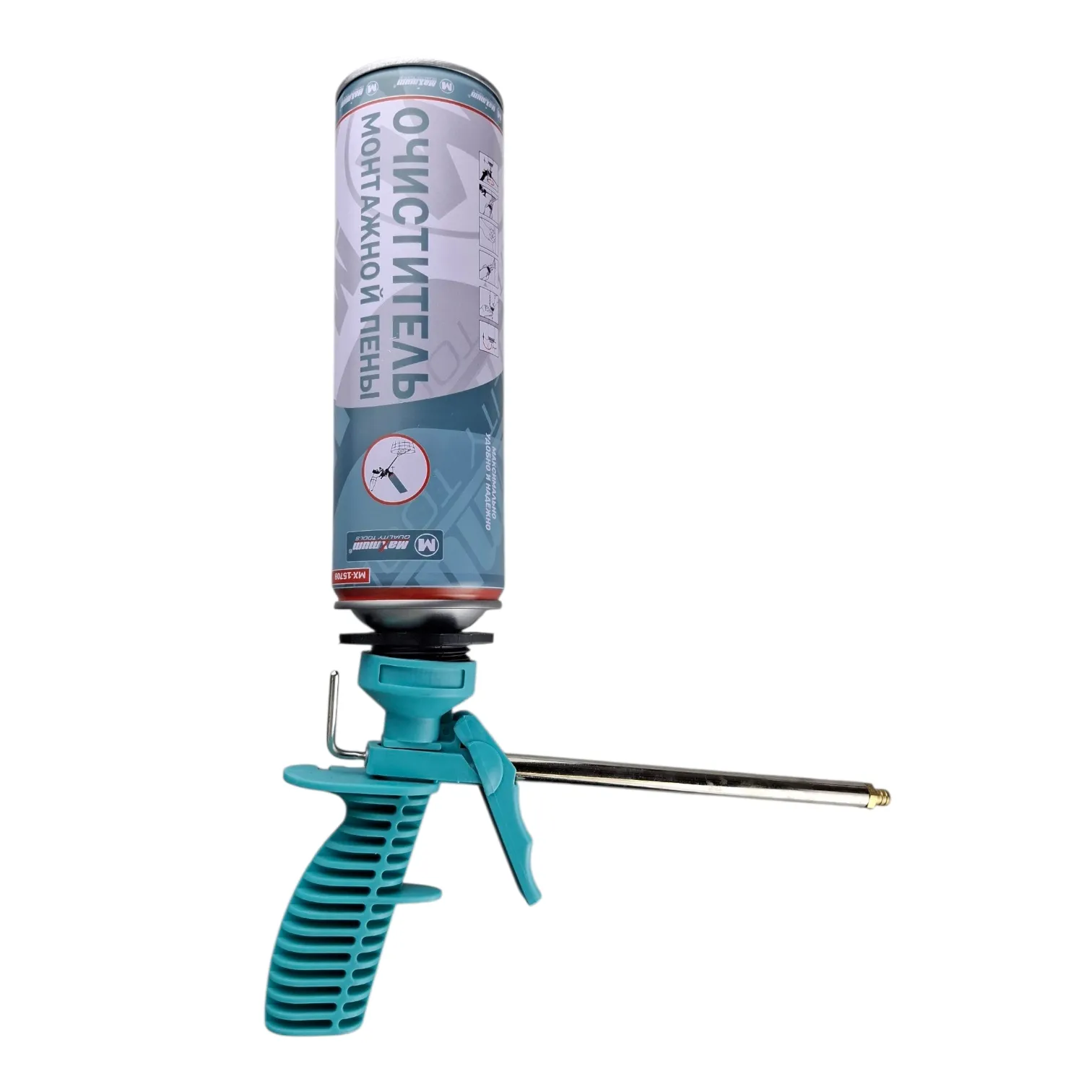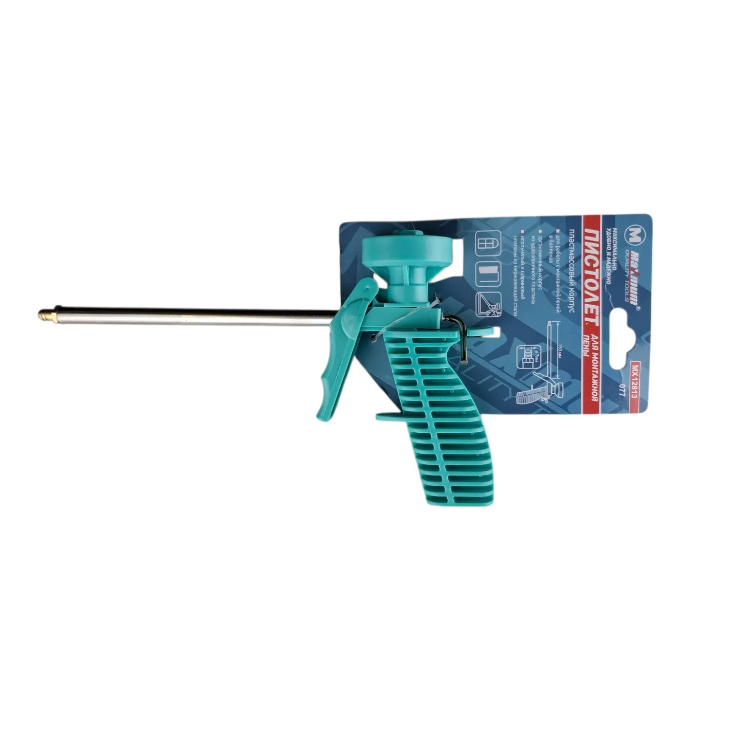 Удобный и легкий пистолет для монтажной пены выполнен в пластмассовом корпусе зеленого цвета.