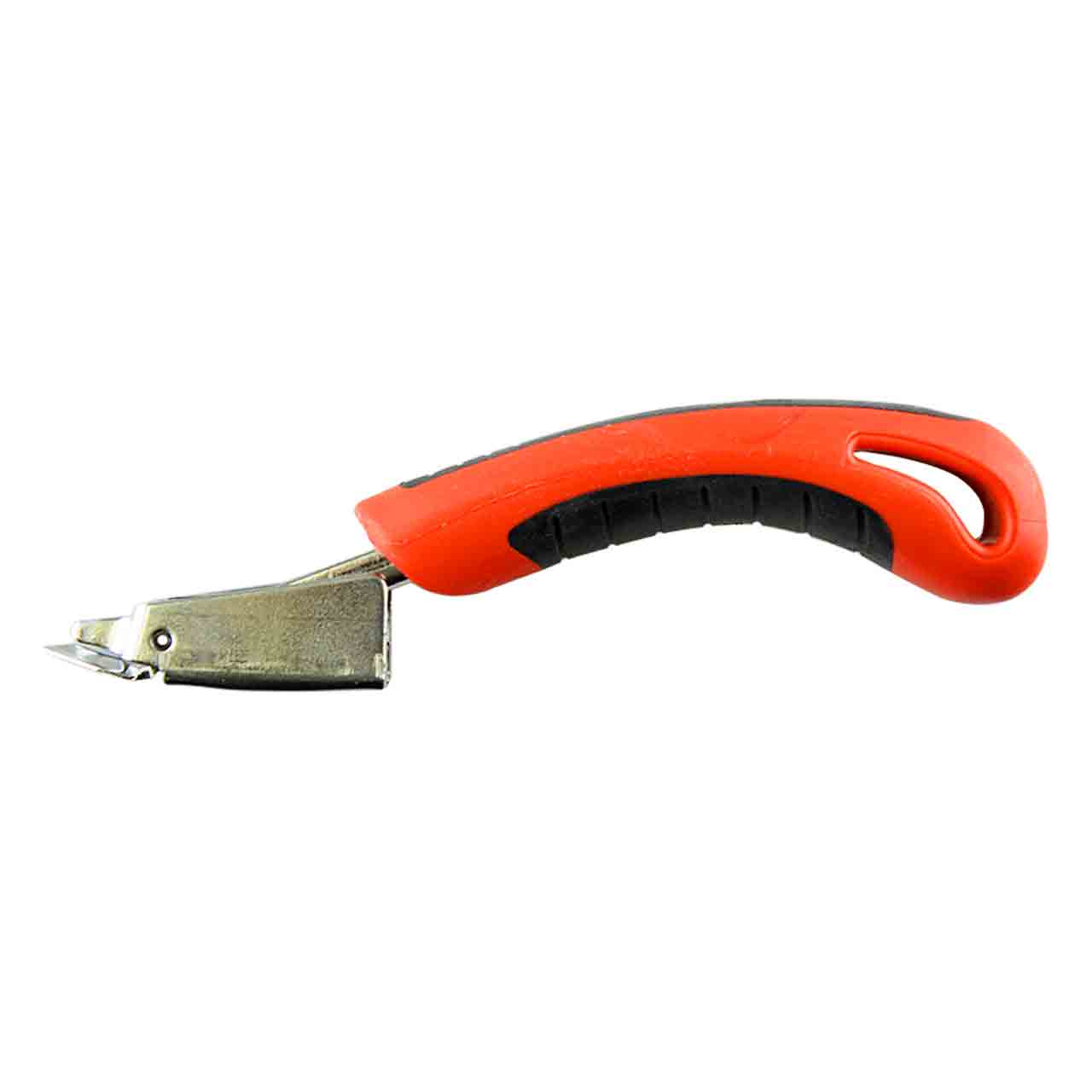 Скобоудалитель универсальный, с фиксатором захвата, усиленный. Основной элемент плавающая стальная каретка, имеющая спереди «зуб» сходящийся к кромке и позволяющий подсунуть себя под центральную перекладину скрепки и подцепить ее.