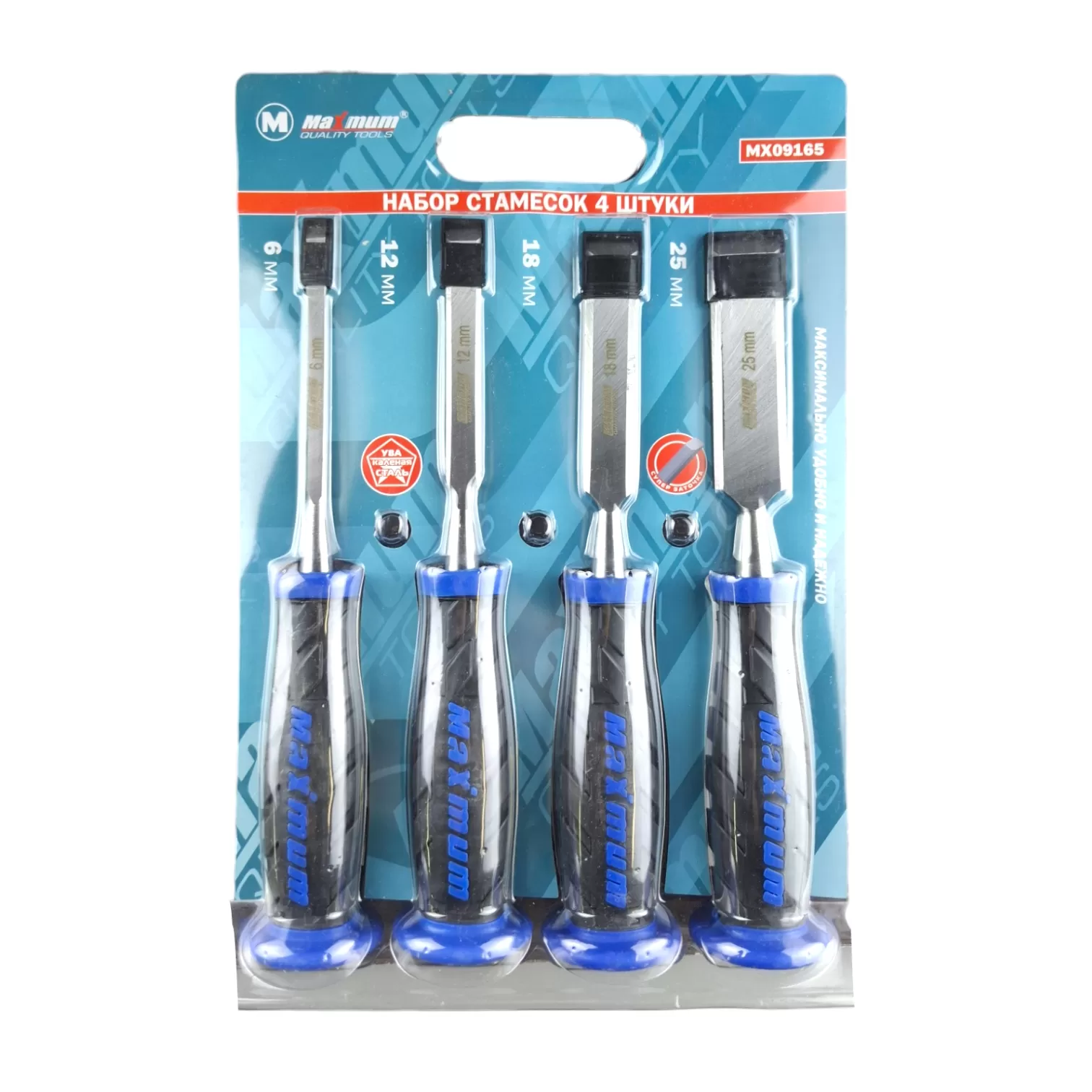 В комплект входят четыре стамески шириной 6, 12, 18 и 25 мм.